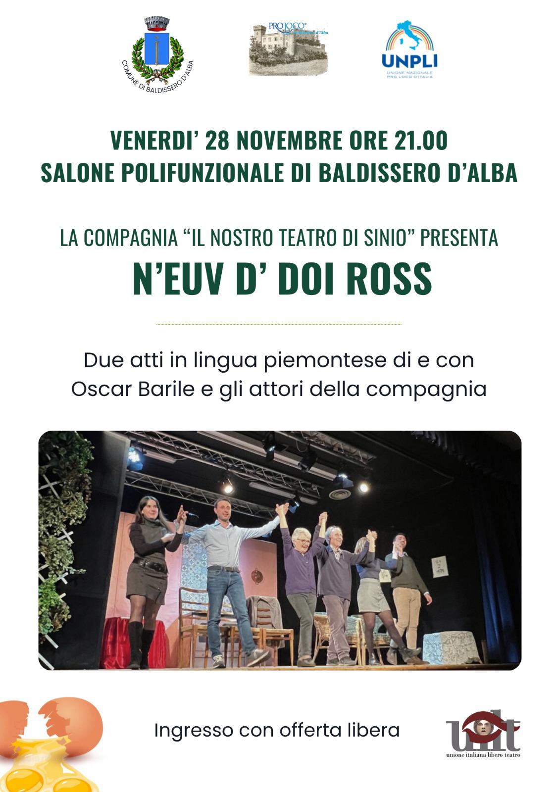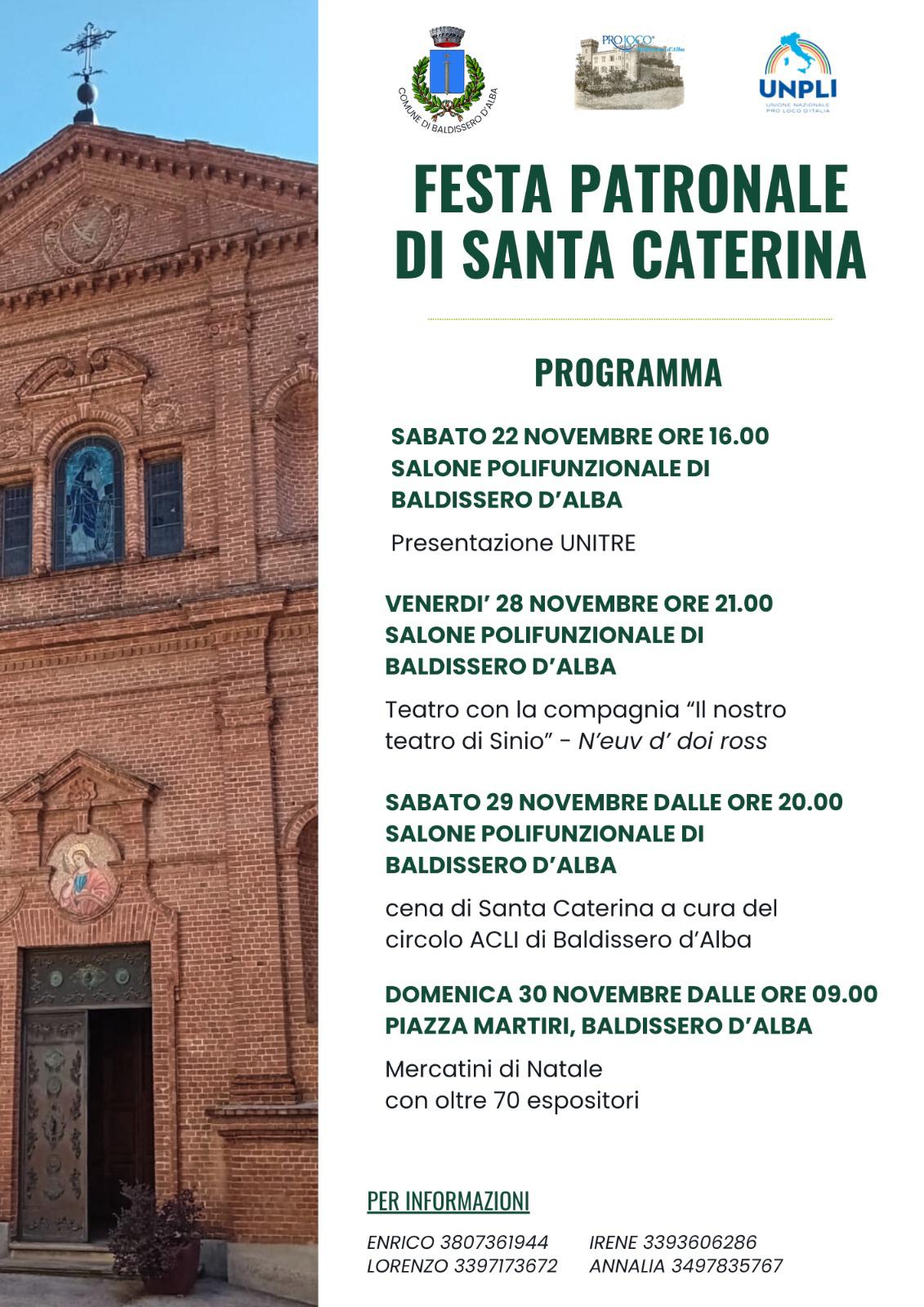 Descrizione in allegato troverete i programmi, menù e presentazione serata del teatro : sabato 22 novembre: presentazione UNITRE presso salone polifunzionale venerdì 28 novembre: presso Salone Polifunzionale, la compagnia "il nostro teatro di Sinio" presenta N'EUV D' DOI ROSS sabato 29 novembre: cena di Sanata CAterina presso il salone polifunzionale con menù composto da 3 antipasti, 2 primi, secondo, dolce e caffé 25 euro domenica 30 novembre: terza edizione mercatini di Natale dalle 9 alle 18 presso piazza Martiri