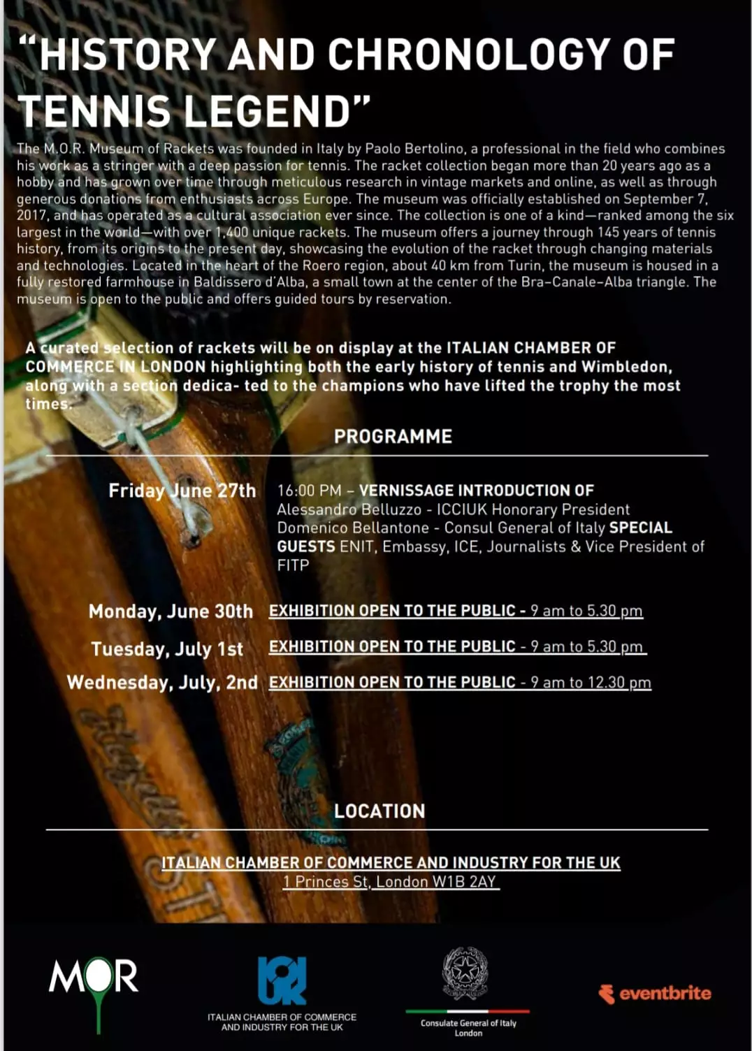Bertolino Paolo, nostro concittadino, collezionista di racchette da tennis e fondatore del museo della racchetta a Baldissero d'Alba, espone per 12 giorni alla Camera di Commercio di Londra, a 700 metri da Buckingham Palace, una parte della propria collezione privata. Stasera 26 giugno 2025 l'inaugurazione alla presenza del Console italiano e dei vertici del tennis.