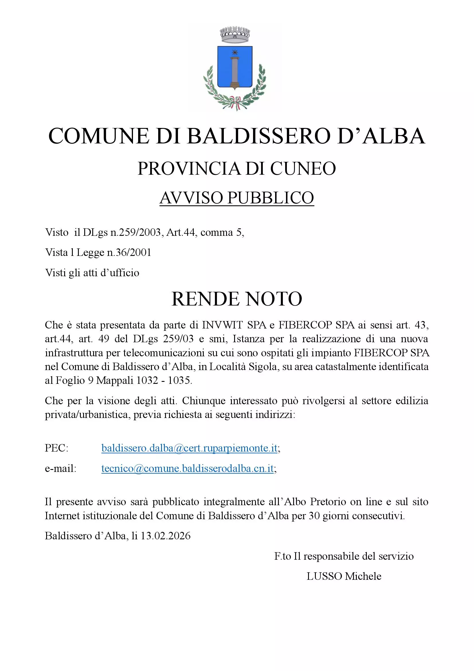 AVVISO: presentazione istanza per la realizzazione di una nuova infrastruttura per telecomunicazioni